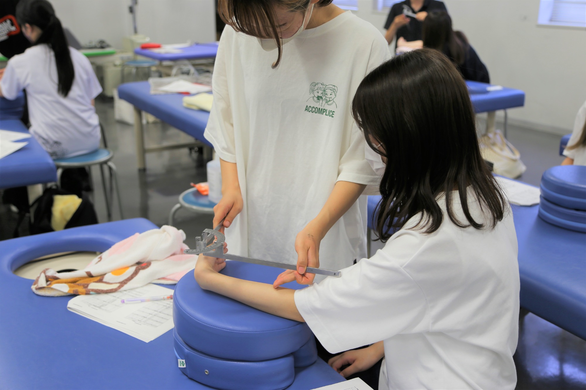今回は「関節可動域検査」についてご紹介します。その名の通り、関節の可動域を調べる検査で、ゴニオメーターという専用の角度計を当てて測ります。定規を当てて測ってるだけじゃない?と思われた方もいるかもしれませんが、簡単そうに見えて実は難しい技術!どこを軸として測るのか、身体がねじれていないかなど、専門的な知識があってはじめて正確な測定をすることができるこの検査。学生同士で演習してみると、きちんとできてる?できてない?と戸惑うことがでてきます。そんなときには、先生がきちんと説明してくれるので安心。関節が柔らかい人はとてもよく曲がるので、お互いびっくりしながら測定していました!