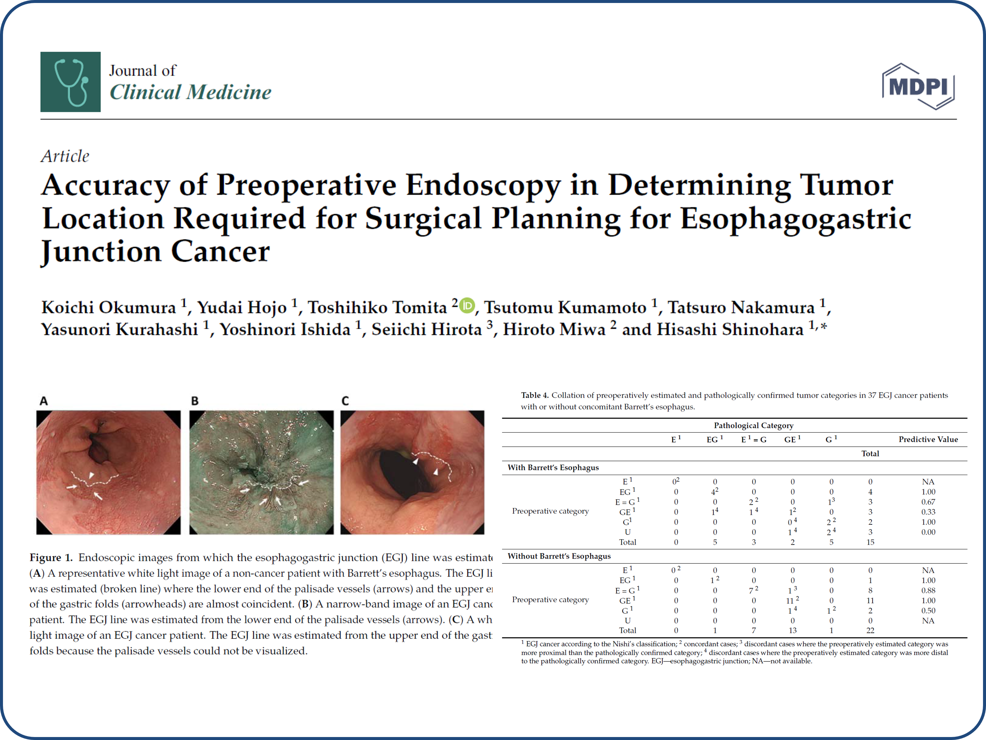 術前内視鏡検査による食道胃接合部癌の局在診断精度を検証した論文です。Journal of Clinical Medicineに掲載されました。