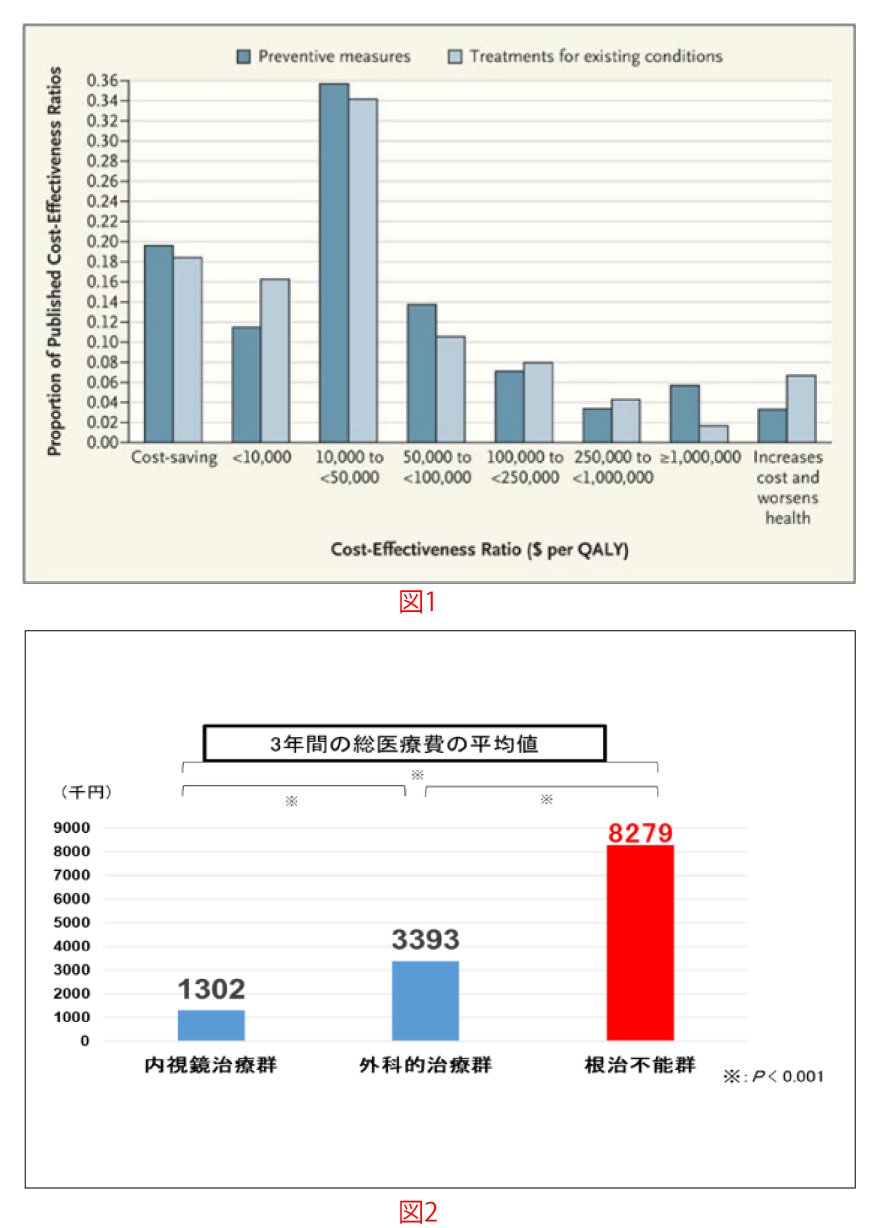 実は、少し古い研究にはなりますが、費用削減につながる予防的な医療行為は全体の20%未満と報告されています(Cohen, Neumann, Weinstein. NEJM. 2008)。私たちは病気が進行して命に関わる前に早期発見早期治療を目指していますが、その医療にはコストがかかるため多くの医療行為は直接的な医療費削減にはつながっていません(もちろん、医療費削減だけが医療の目的ではありませんが)。 図1