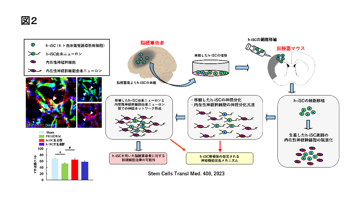 当部門では、脳傷害病態下に生体内に誘導される自己の内在性神経幹細胞の発掘を独自に試み、マウス脳梗塞巣(Eur J Neurosci, 29, 1842, 2009; Cells, 12, 2040, 2023)及び脳梗塞患者の梗塞巣(Stem Cells Dev, 26, 787, 2017)に、脳傷害病態時に特異的に誘導され、神経分化能を有する内在性幹細胞(傷害/虚血誘導性幹細胞;injury/ischemia-induced Stem/Progenitor Cell: iSC)が存在することを世界に先駆けて報告してきました(図1)。