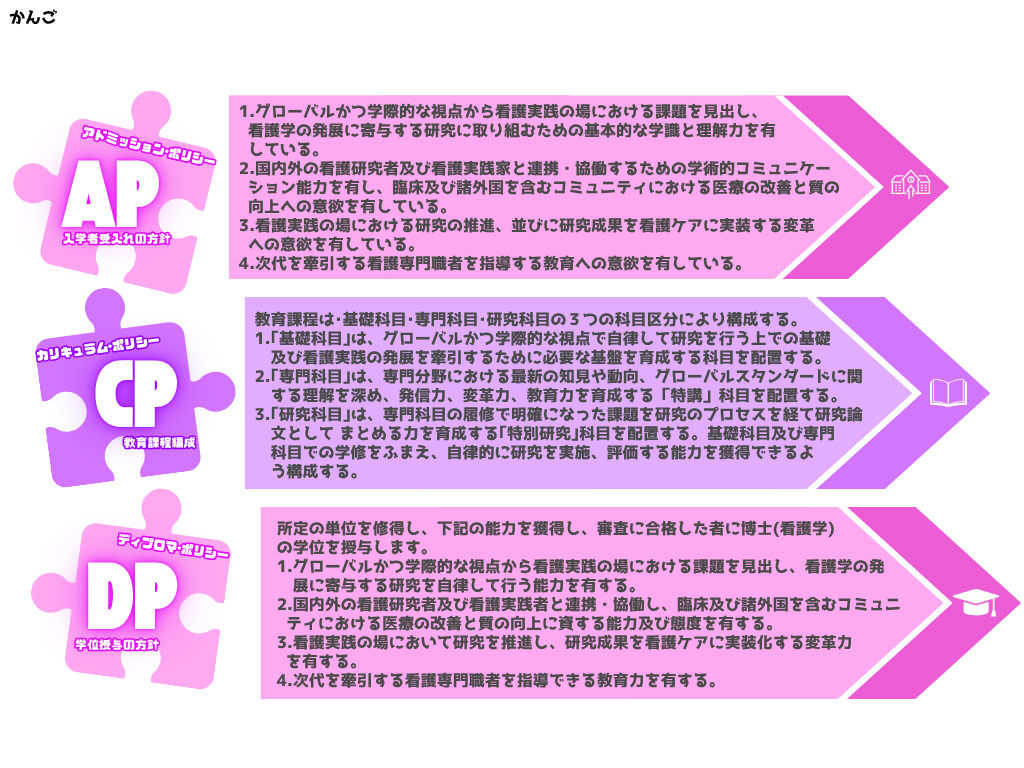 医療・保健・福祉及び社会の変動に対応して、生命と人権を尊重し、看護学を中心としたグルーバルかつ学際的な知識に立脚し、看護ケアを創造、実装、展開させることができる人材並びに看護の場における実践・管理・教育・研究に携わる人材を育成します。