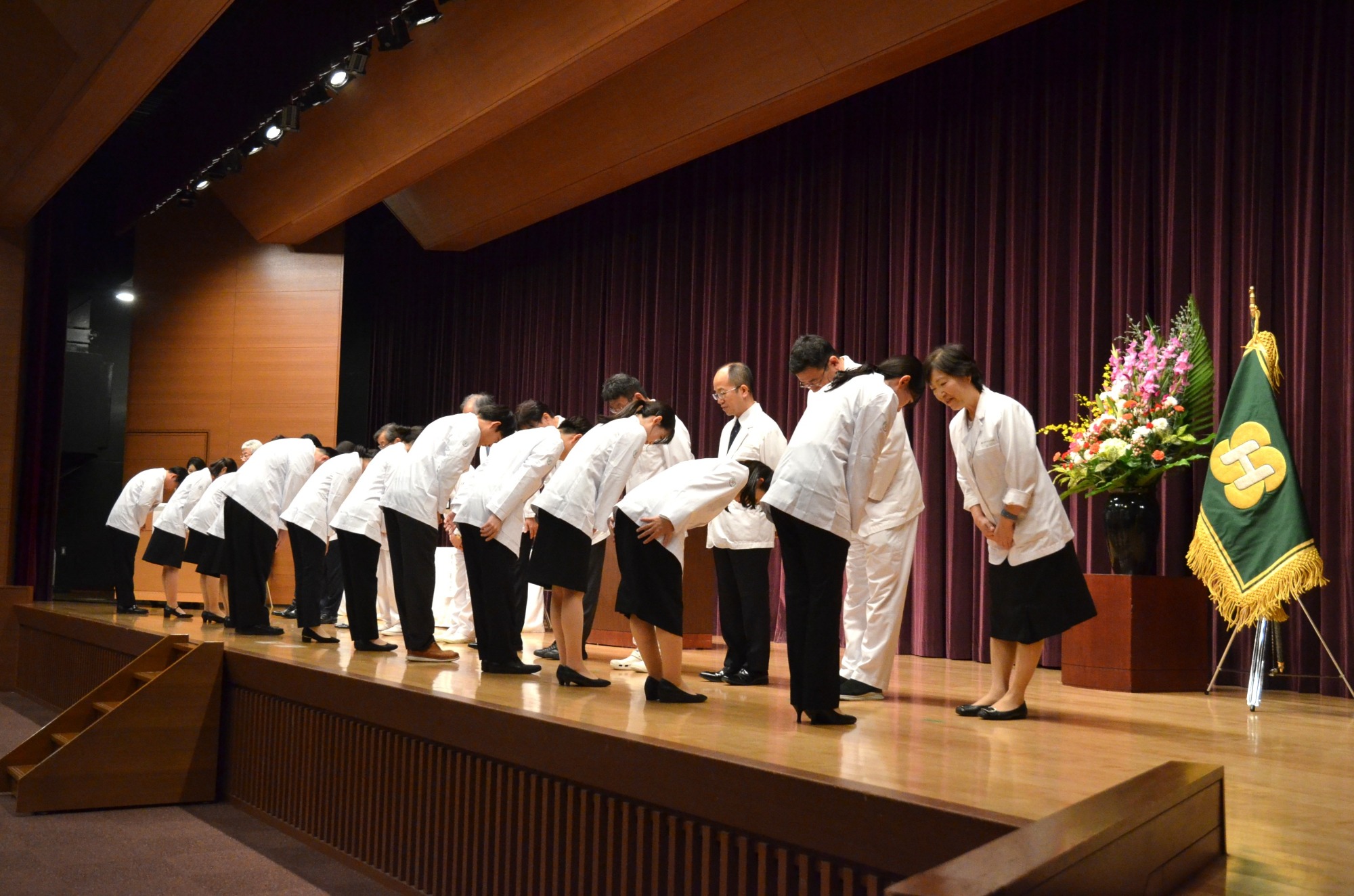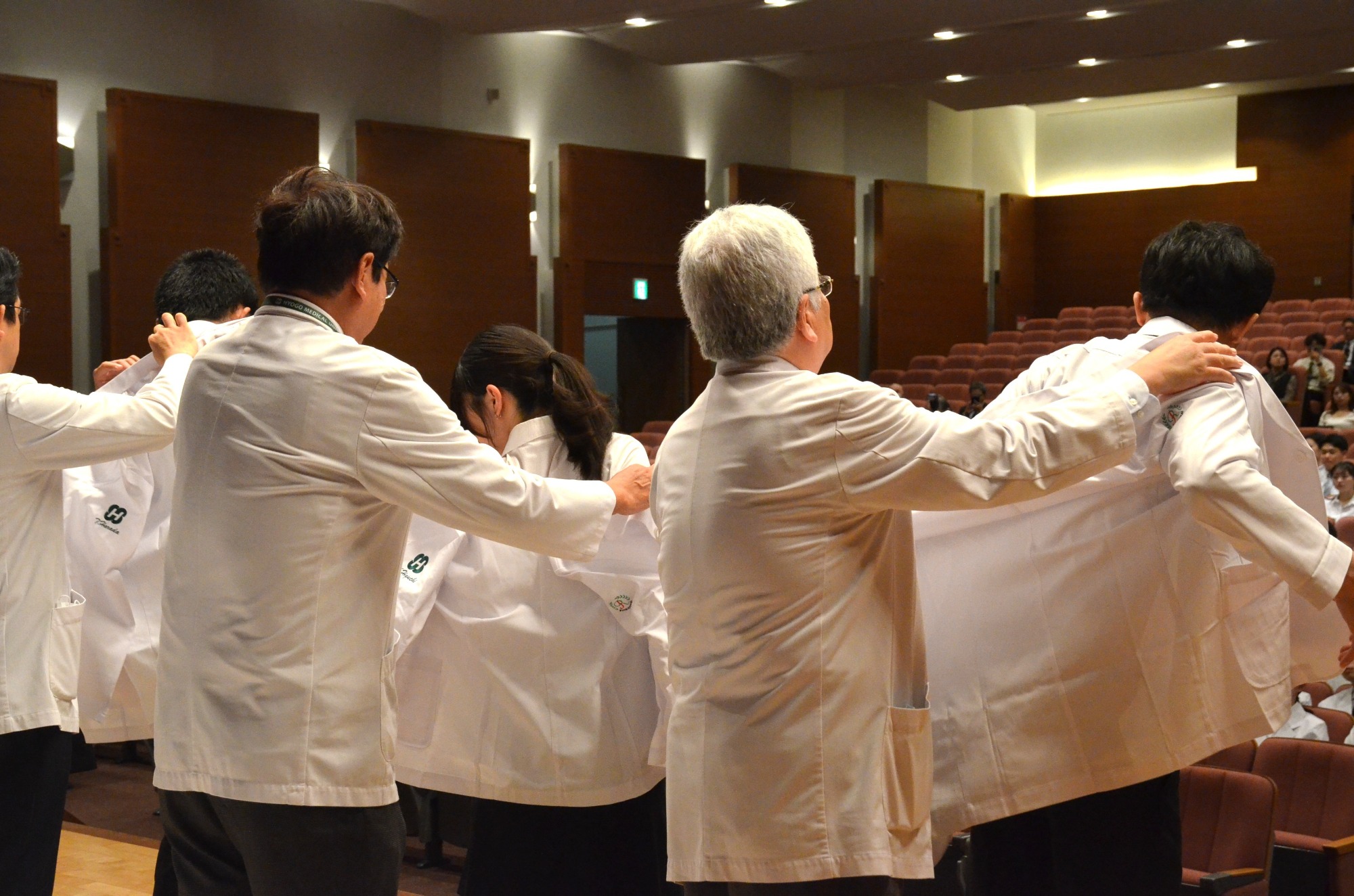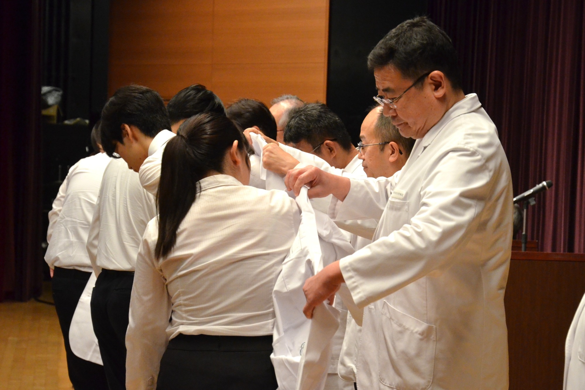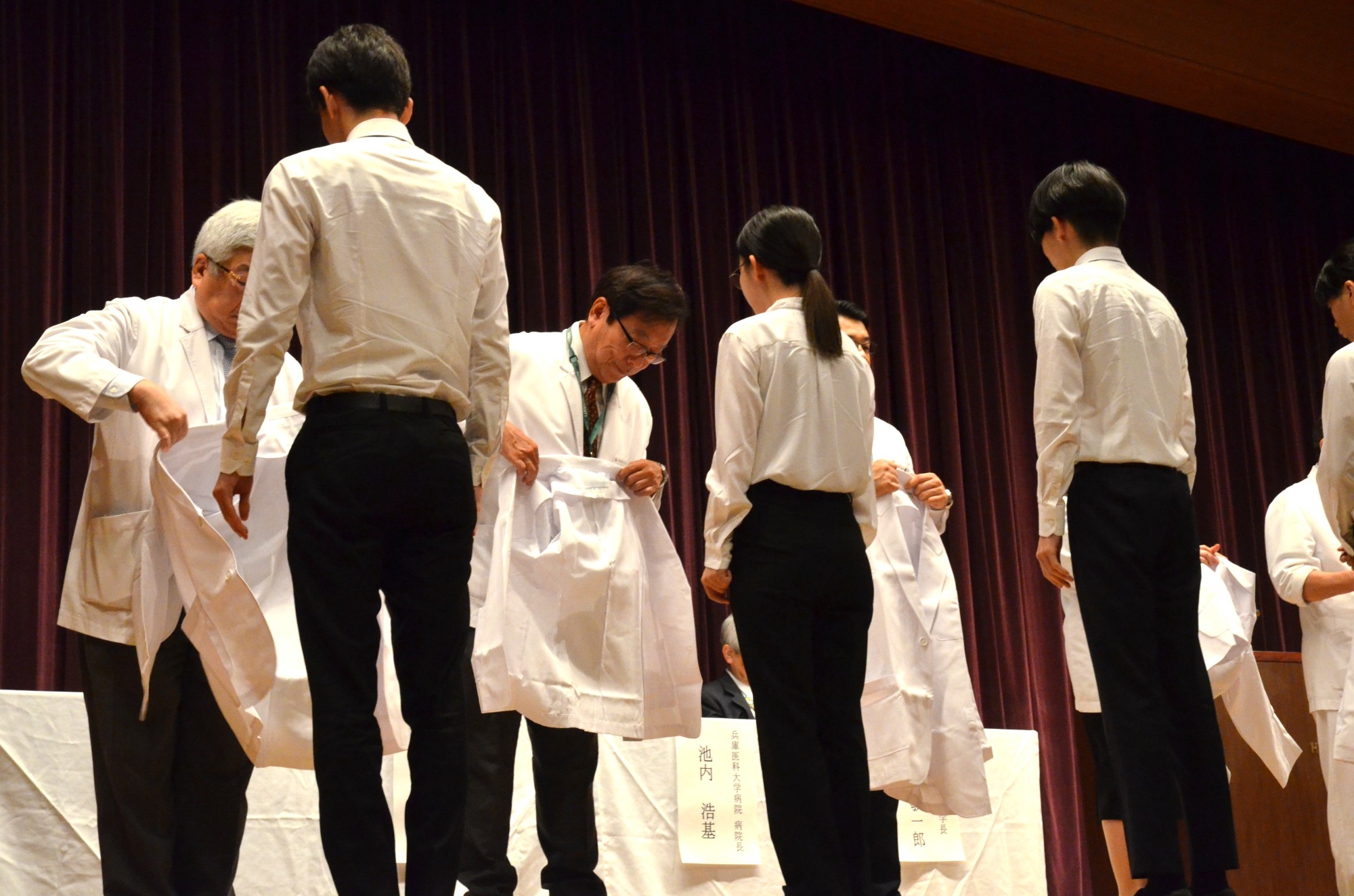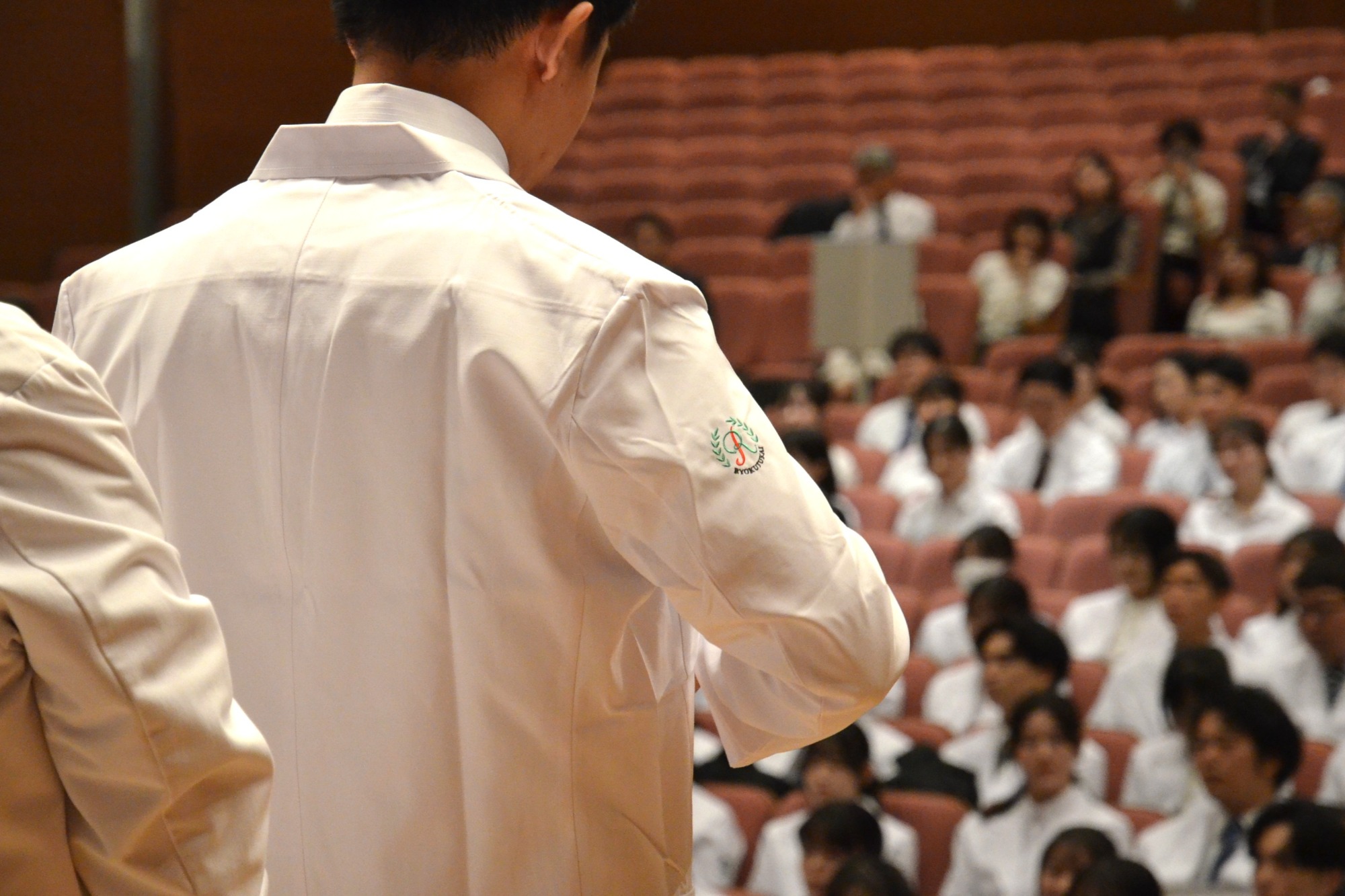 式典中、少し緊張した面持ちの学生たちは一人ずつ名前を呼ばれると壇上に上がり、保護者の方々が見守る中、教員から着せてもらった白衣に袖を通しました。