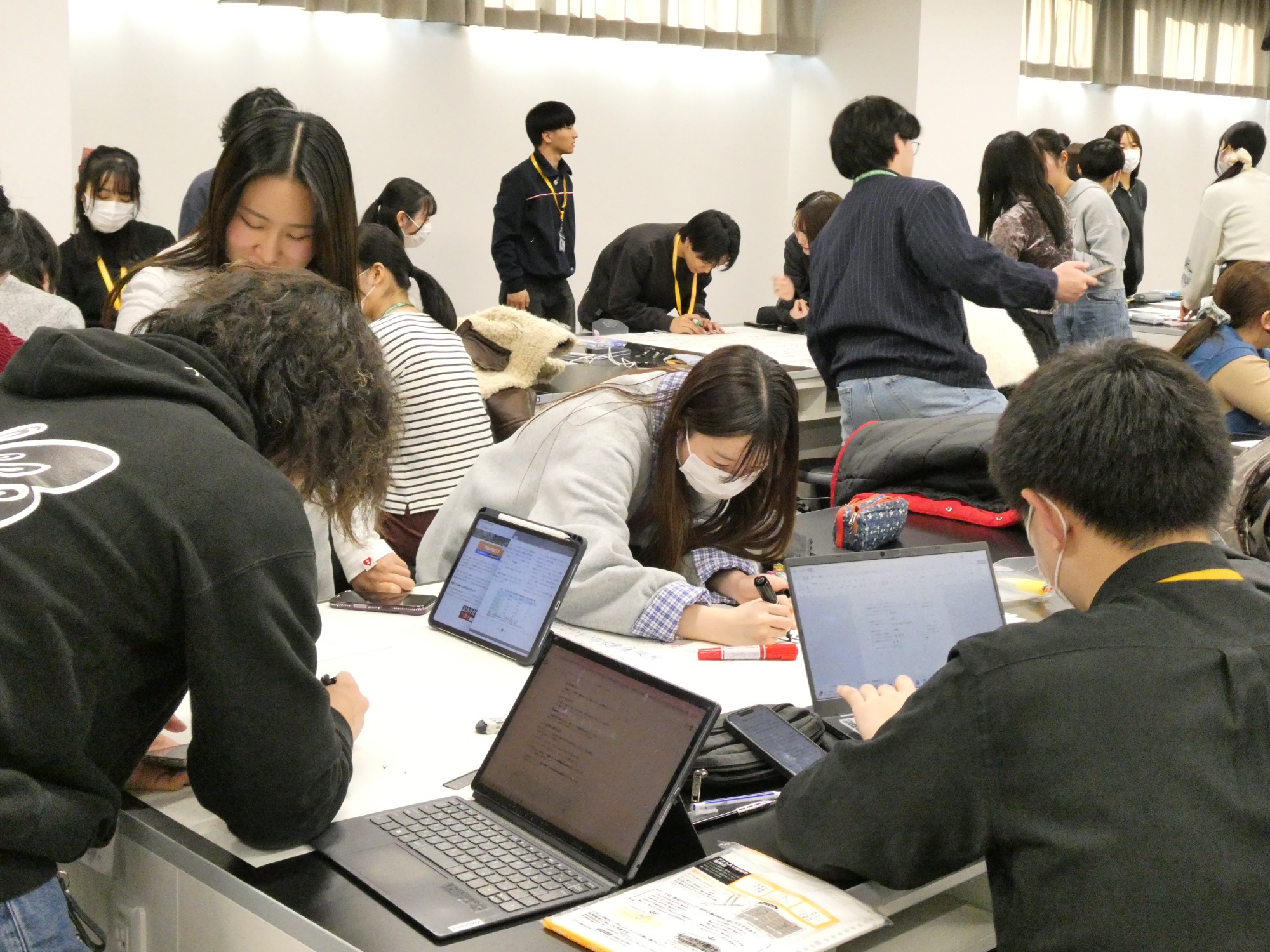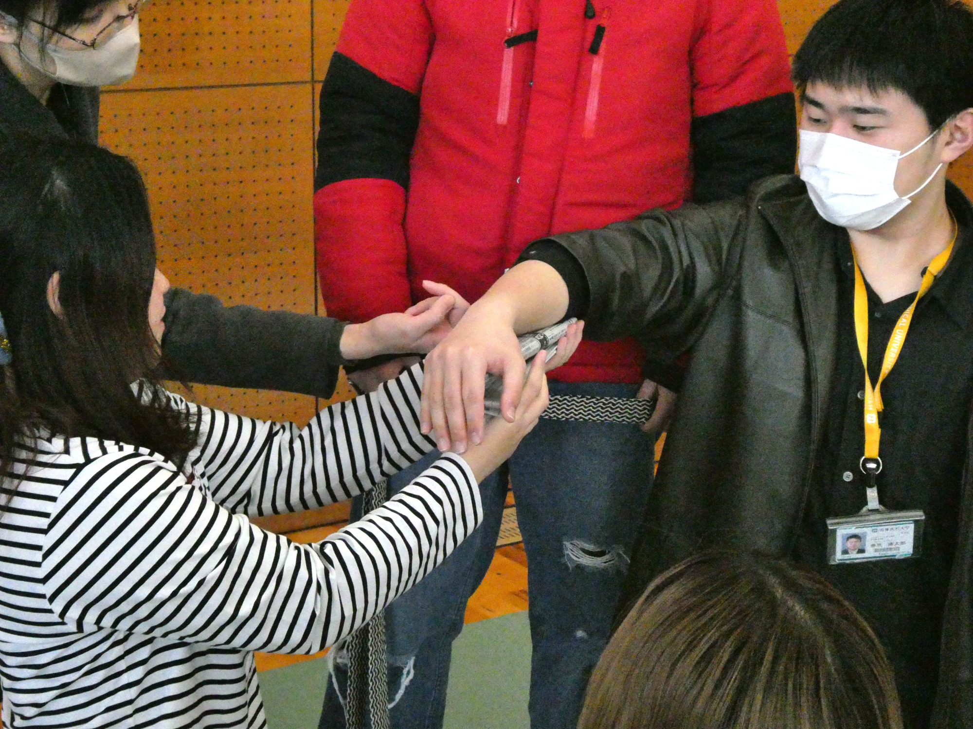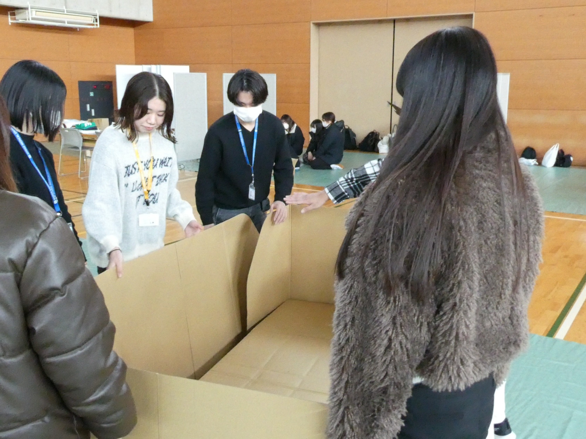 2026年2月10、12~13、16日の4日間、本学2年生を対象とした多職種連携教育の体験型演習「チーム医療概論」を実施しました。本科目は、4学部の学生6~7名でチームを構成し、チームビルディングや多職種連携の重要性を体験的に学ぶことを目的としています。今年度は、「災害関連死を防ぐためには」をテーマに掲げ、学生自身が組み立てた段ボールベッドに横になったり、簡易トイレに座ったり、使い捨てトイレの試用、限られた物資の中での応急処置などを体験しました。さらに、健康維持に欠かせない避難所の食事や栄養、災害支援食、口腔ケアの重要性についても学びました。また、避難所運営ゲーム「HUG(Hinanjo Unei Game)」を活用し、刻一刻と変化する状況下での協働や情報共有の難しさを体験しました。これらの体験から避難所の医療・生活支援における問題点や課題について討議し、ポスターを作成しました。最終日の発表会では、多職種の視点を活かした解決策の提案や考察が示され、活発な質疑応答でさらに理解を深める場となりました。本授業を通じて、学生たちは将来の専門職としての意識を高め、互いの専門性を尊重しながら協働することの重要性を実践的に学びました。