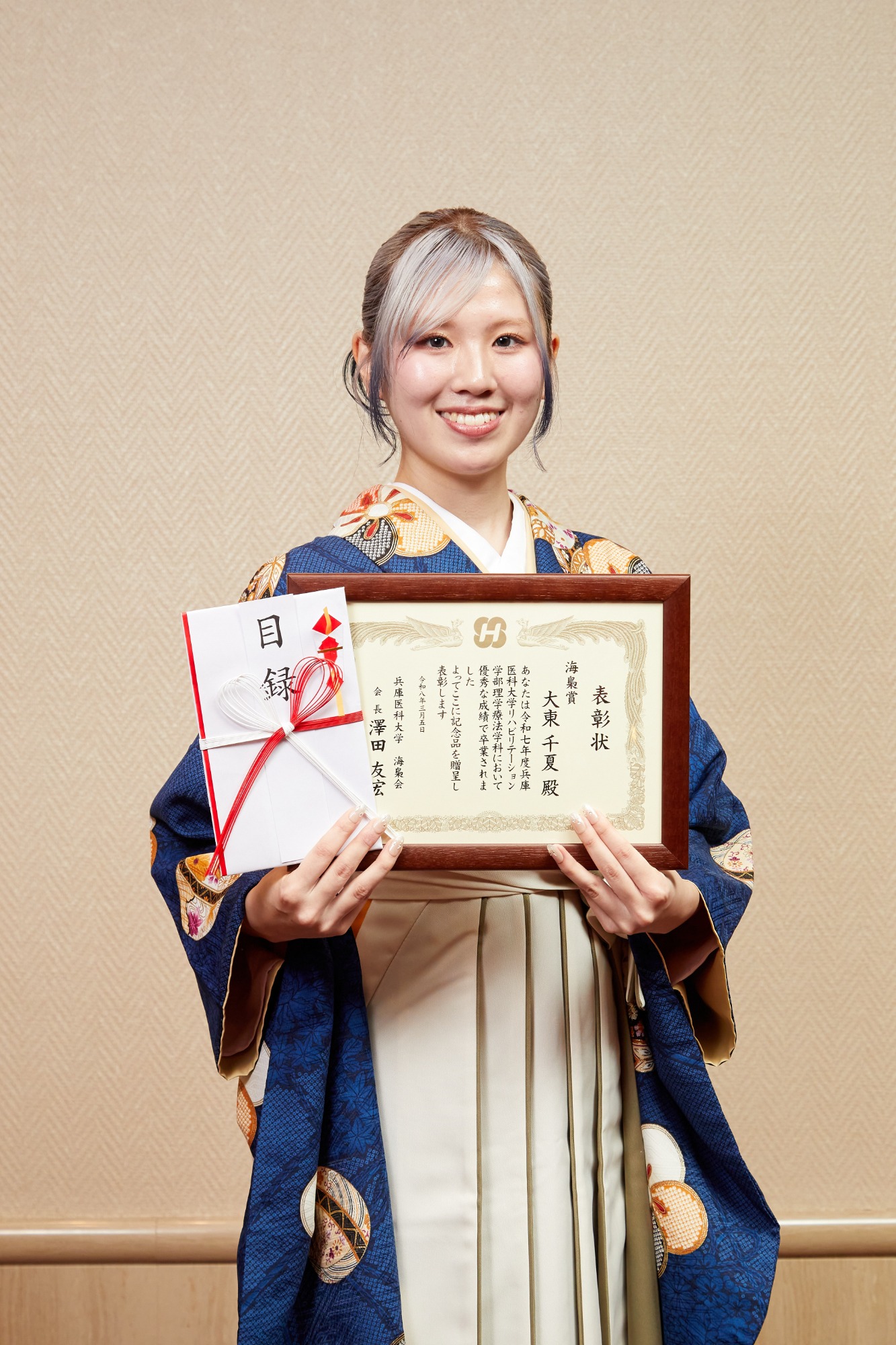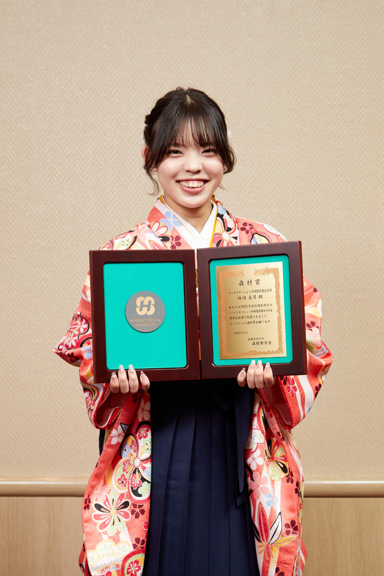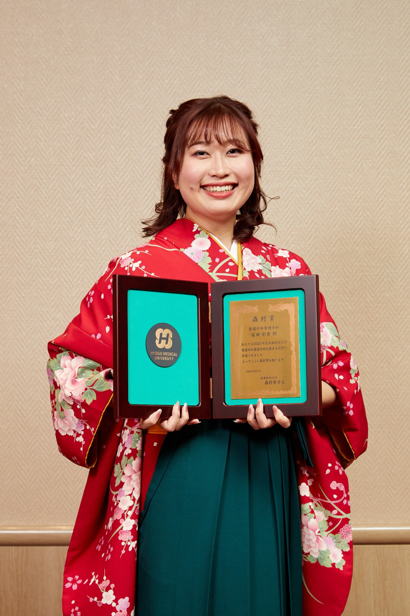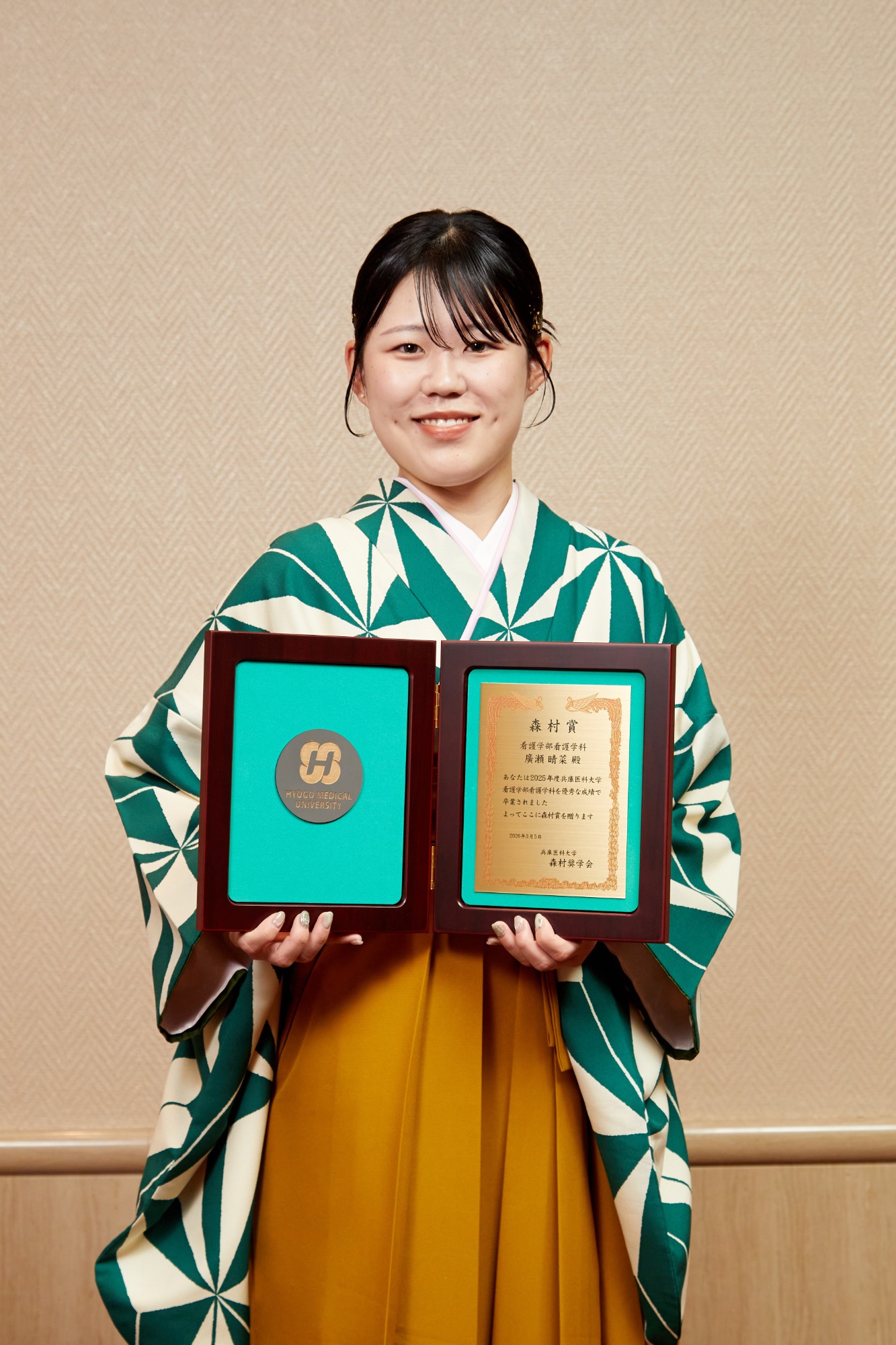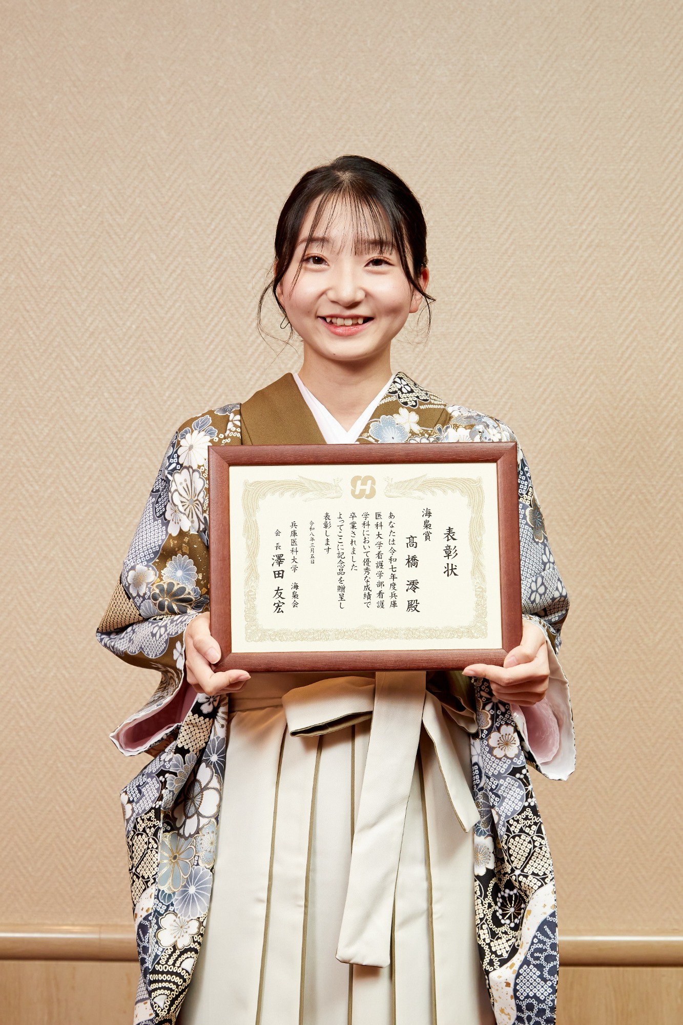 このような素晴らしい賞をいただき、大変光栄に思います。 先生方や友人、多くの方々の支えがあってこそと感じています。 これから看護師として新たなスタートラインに立ちますが、感謝の気持ちと学ぶ姿勢を忘れず、安心して頼っていただける看護師を目指して歩み続けていきます。