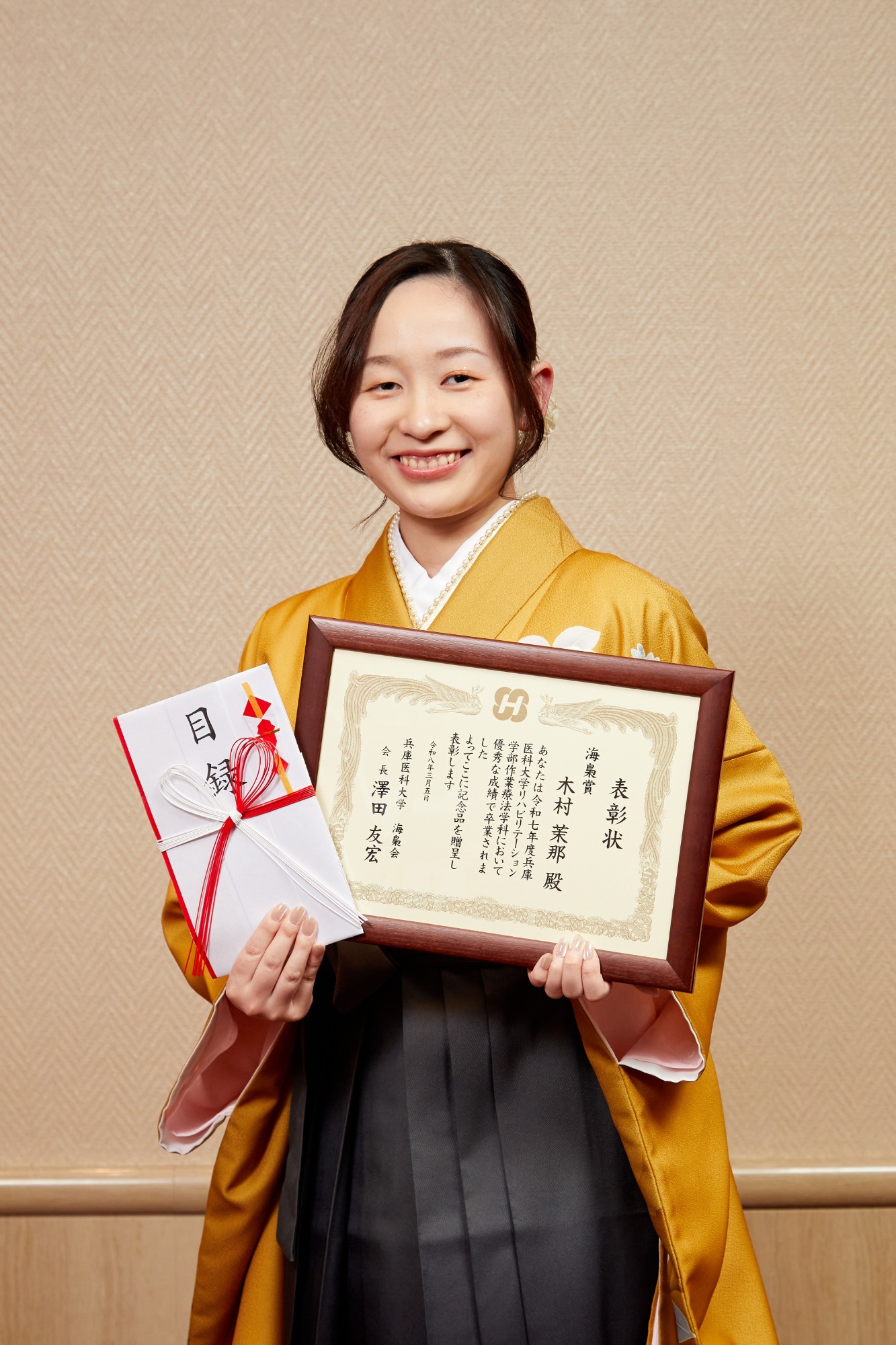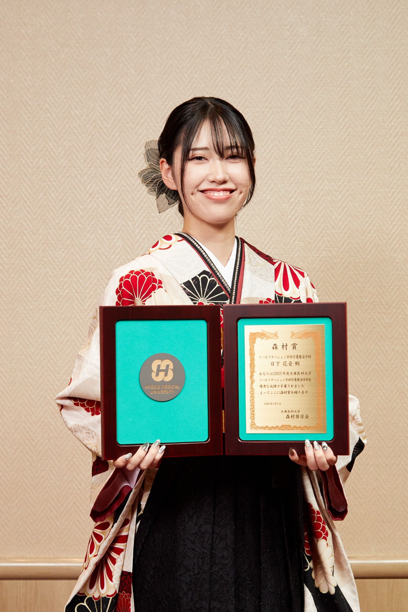 このような素敵な賞をいただくことができ大変嬉しく思います。友人や先生方のおかげで、学業やさまざまな活動に打ち込むことができ、充実したかけがえのない4年間になりました。兵庫医科大学に入学できて本当に幸せでした。 これまでの経験と感謝を胸に、優しさと強さを持った作業療法士になれるよう努力していきます。