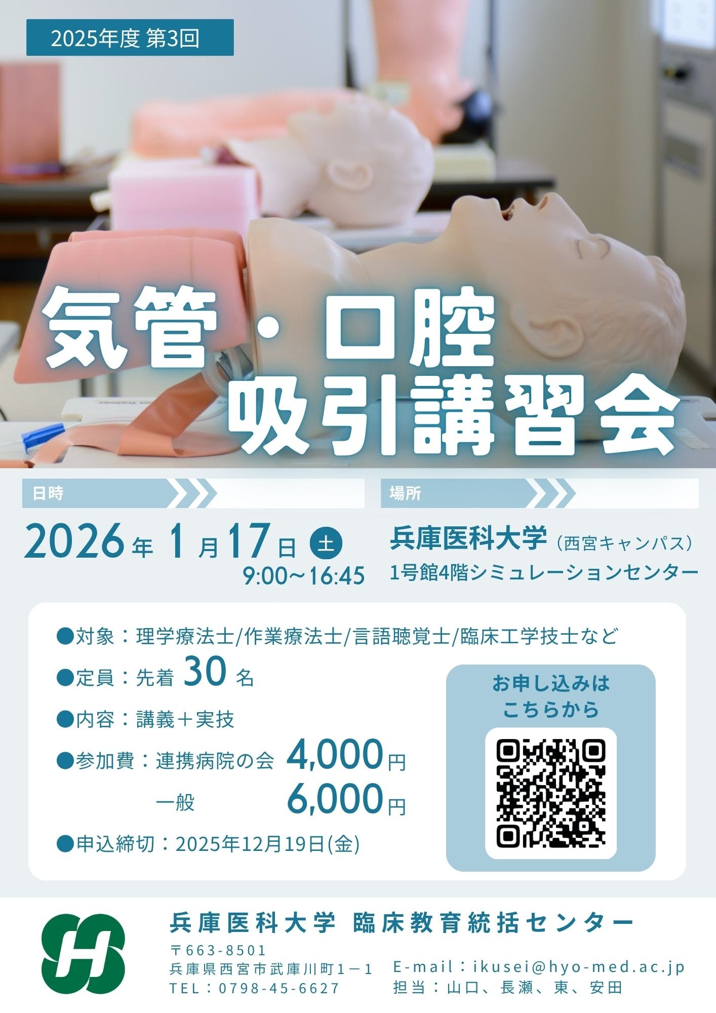 2025年度第3回目となる「気管・口腔吸引講習会」を開催いたします。 詳細は以下のリンクをご覧ください。 なお、2025年度は6月・9月・1月の合計3回を開催しています!