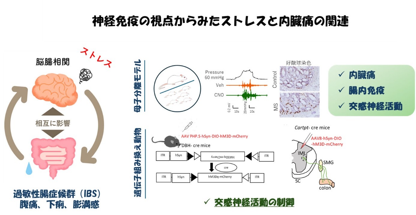 IBSは、腹痛や下痢、便秘を繰り返す機能性消化管疾患であり、世界人口の約15%が罹患するとされています。器質的異常がみられないにもかかわらず、粘膜に軽度の炎症が存在し、肥満細胞や好酸球などの免疫細胞の浸潤が内臓痛と関連する可能性が報告されています。しかし、これらの免疫変化を引き起こす要因は明らかではありませんでした。一方、心理社会的要因、特に幼少期のストレス経験は、成人期にIBSを発症するリスクを高めることが知られており、その際に交感神経系(SNS)の過敏化が生じることが報告されています。SNSはノルアドレナリンを介して免疫系に作用し、免疫応答を抑制または促進することが知られていますが、IBSの発症における末梢SNSの関与は未解明でした。本研究では、ストレスと腸管粘膜の免疫変容の関係、さらに内臓痛の発症との関連を明らかにすることを目的としました。