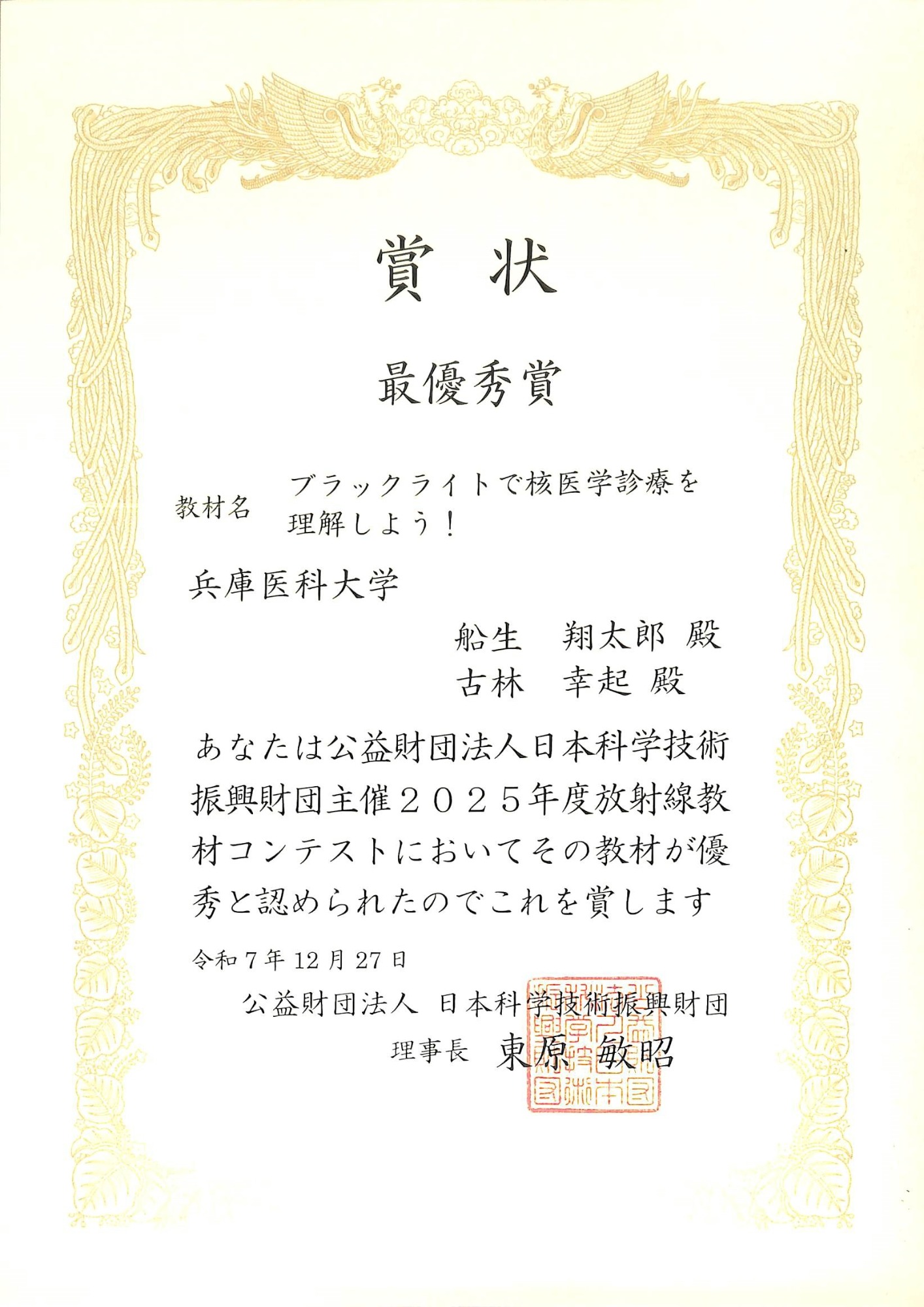 公益財団法人日本科学技術振興財団が主催する放射線に関する正確な知識・技能の普及啓発を目的とした「2025年度放射線教材コンテスト」において、薬学部 藤野 秀樹 教授の研究室に所属する薬学部5年生の船生 翔太郎さん、古林 幸起さんの2名が最優秀賞を受賞しました。本コンテストでの受賞は今回で6年連続となります。