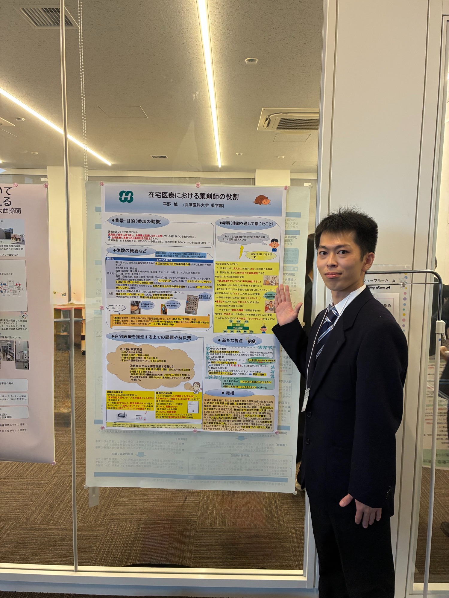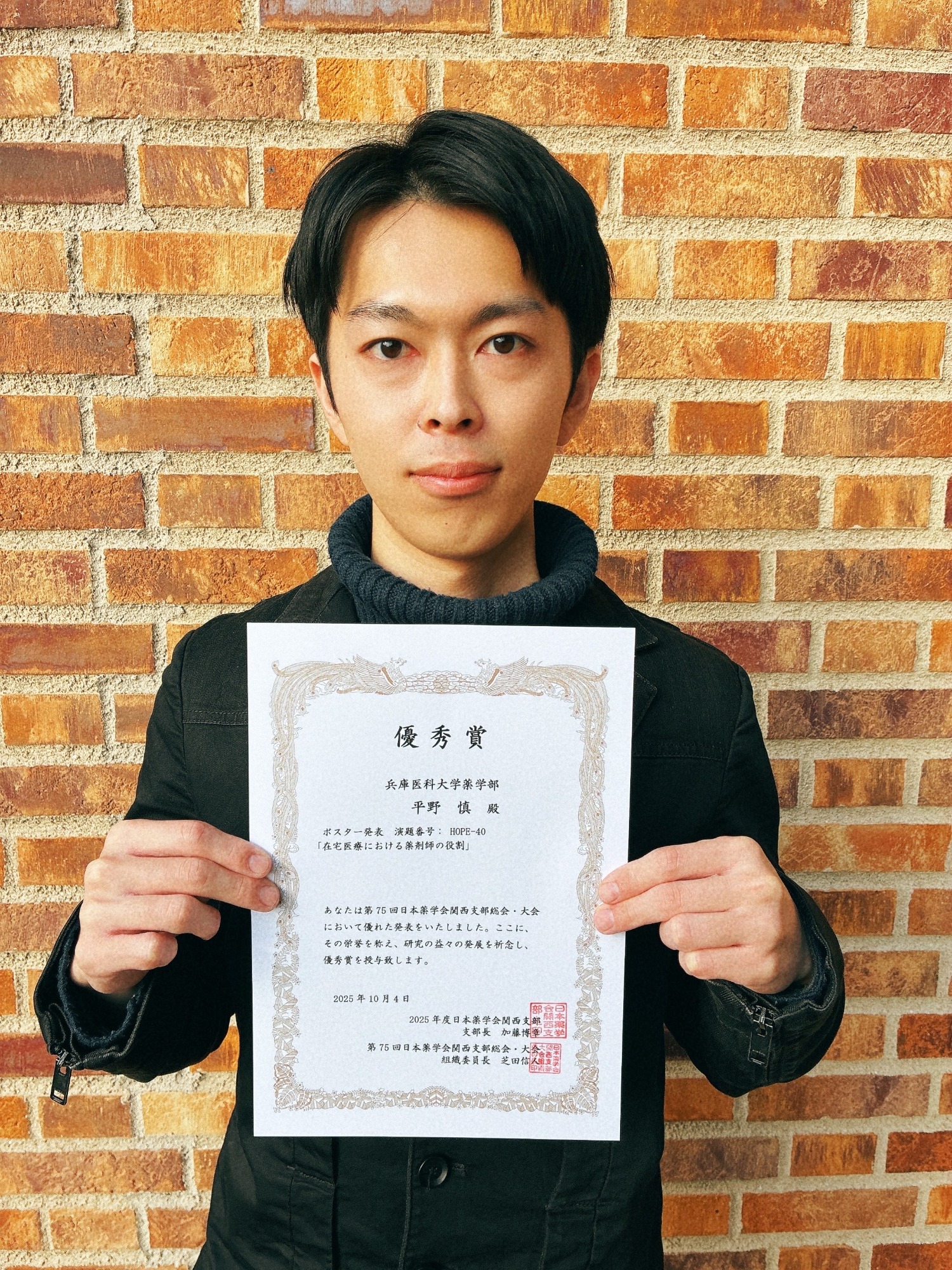 本学薬学部4年生の平野 慎さんが、第75回日本薬学会関西支部総会・大会で「在宅医療推進教育プログラム(HOPE) 優秀ポスター賞」を受賞しました。本賞は、エントリーされた発表の中で特に優秀であった者に授与されるものです。在宅医療推進教育プログラム(HOPE)は、日本薬学会関西支部が主催する薬学生向け教育プログラムで、実習前に在宅医療の現場を体験し、その成果を発表することにより、地域医療を担う薬剤師の育成と研究への意欲醸成を目的としています。