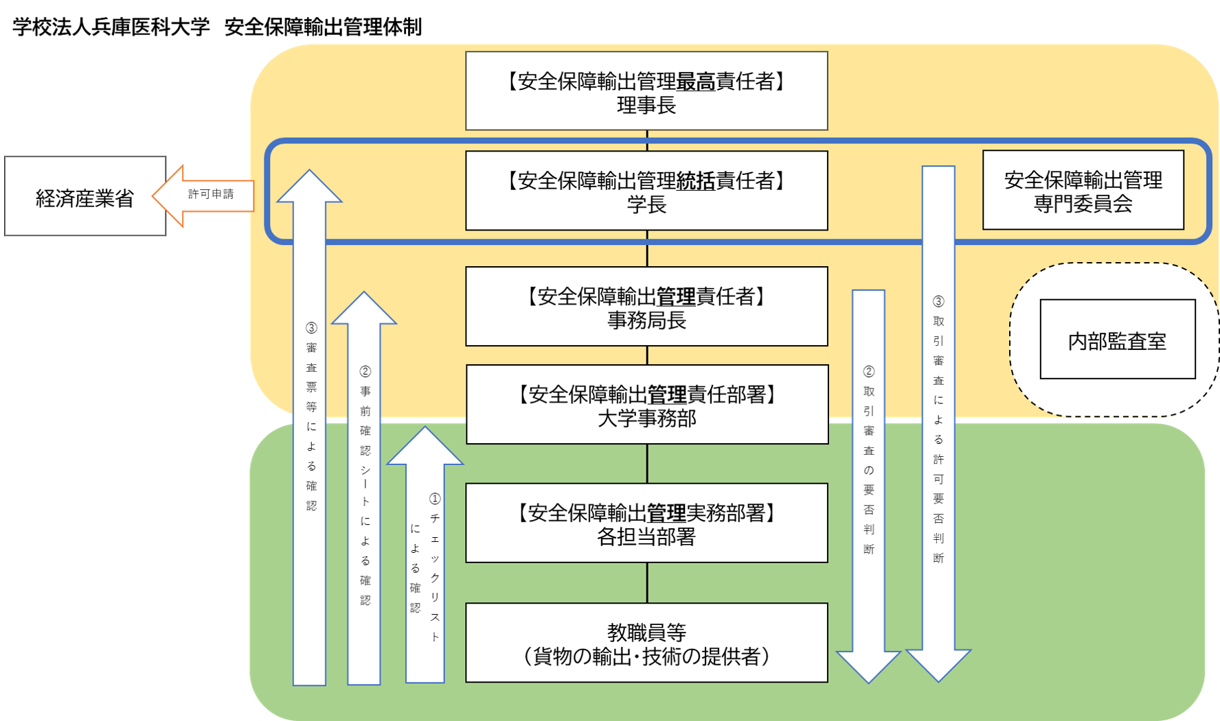 「学校法人兵庫医科大学安全保障輸出管理規程」を制定の上、体制を整備し、海外の研究機関・企業等との共同研究・受託研究、海外出張や海外からの留学生・研究員等受入の際には、別途定める「チェックリスト」による確認を行い、必要に応じて「事前確認シート」による確認や取引審査を行います。